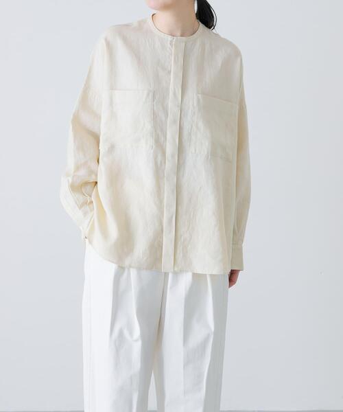 胸元のポケットがさり気ない存在感を放つデザイン 1枚で様になり、羽織りとしても活躍する前開きのシャツ。ワイドシルエットとコンパクトな首元が抜け感をもたらしています。身幅はたっぷりとしていて着心地の良いサイズ。ボタンが見えない比翼仕様がミニマルなムードを演出しています。生地はしなやかでハリがあるリネンを使用。上半身のラインを拾わずスッキリとした印象に。上質感のある洗練された色展開にも注目です。同素材や同型のシリーズアイテムもぜひご覧ください。 【FABRIC】 ・毛羽が少なく柔らかさとコシを兼ね備えた素材感 ・さらっとしたタッチでロングシーズン活躍 【POINT】 ・ストレートシルエットのスカートとも好相性 ・日常にもお仕事にもシーンを問わず着まわしが可能 【2026 Spring/Summer】【26SS】 ※商品画像は、光の当たり具合やパソコンなどの閲覧環境により、実際の色味と異なって見える場合がございます。予めご了承ください。 ※商品の色味の目安は、商品単体の画像をご参照ください。 ▼お気に入り登録のおすすめ▼ お気に入り登録された商品は、マイページにて現在の価格情報や在庫状況の確認が可能です。 お買い物リストの管理にぜひご利用ください。 素材感 透け感 : ややあり(YELLOW, LIGHT GRAY) 伸縮性 : なし 裏地 : なし 光沢 : なし ポケット : あり LIGHT GRAY:162cm(Feee) / 167cm(Free) NAVY:162cm(Feee) / 167cm(Free) YELLOW:167cm(Feee) / 162cm(Free) Free