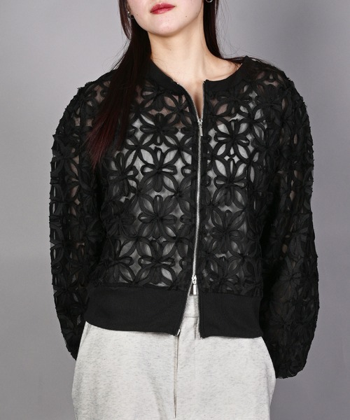 今季トレンドのチュールブルゾン。 バルーンスリーブと花柄が女性らしさを引き立てます。 ダブルジップでこなれ感をプラスして、大人カジュアルを楽しんでください。