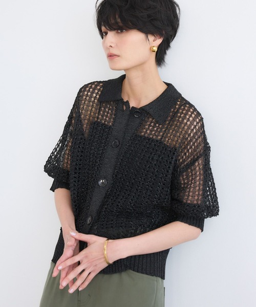 軽い着心地とシアーな編地が素敵な襟付きニット・清涼感のある透かし編みで仕立てられた、ポロ襟付きの五分袖ニット・フロントはボタンあきになっており、羽織りとしても◎・袖は肘にかかるくらいのやや長めのパフスリーブ風で、フェミニンな要素をプラス・襟元があることで、カジュアルすぎない品のあるデザインに【スタイリング】シンプルコーデも華やかにまとまる、大人可愛いデザインニットです。パフスリーブ風の袖も肘に掛かって腕をカバー。パンツもスカートもバランスの取りやすいシルエット。インにはカップ付きのキャミや、タンクを入れて夏まで活躍のトップスです。【素材】お手入れ方法:ハンドウォッシャブルドライな質感と軽さが特徴のテープヤーンを使用。ポリエステルにギマ加工(糸を樹脂で表面コーティングしてサラッとしたドライな風合に変える)を施した素材。ざっくりとした透かし編みは通気性に優れ、真夏でも快適に着用できます。お買い物をお得にもっと楽しく!上手な活用方法>>>▼商品のお気に入り登録▼完売カラーの再入荷通知や、ラスト1点の通知、プライスダウンしたセール通知も受け取ることができます。▼ブランドのお気に入り登録▼新作や再入荷等、いち早くブランドのお得な情報を受け取ることができます。【ご注意】※屋外の光や照明の当たり具合で、実際の商品の色味とカラー別画像の色味に若干の違いが発生する場合がございます。詳細画像と併せてご確認の上、ご注文いただきますようお願い致します。※サンプルにて撮影をしておりますので、実際の商品とは色味・仕様や加工・サイズ等が若干異なる場合がございます。予めご了承くださいませ。