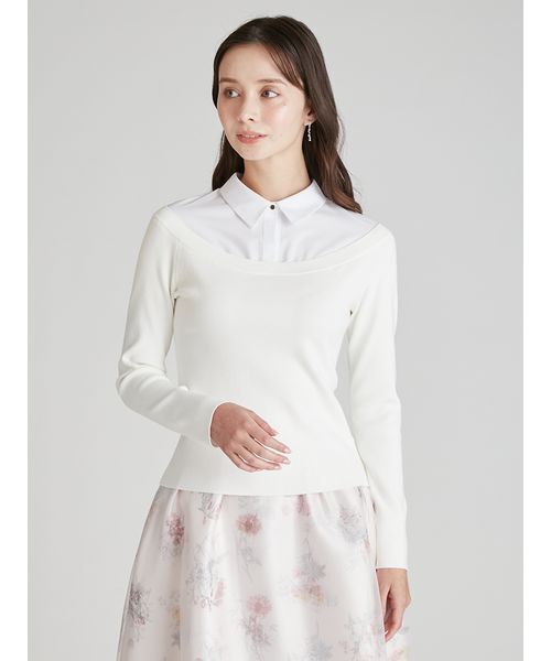シャツとオフショルニットのレイヤード風ニットプルオーバー。身頃はすっきりとした綺麗なシルエットを追及しました。シャツは釦の開閉により印象を変えることが出来る為、シーンや好みに合わせた着こなしをお楽しみいただけます。釦を開けた際には、抜けた襟になるように設定している為、自然にニュアンスのある襟元にすることが出来ます。【おすすめ骨格タイプ】■骨格ストレート■骨格ナチュラル透け感:無し,裏地:無し,伸縮性:ニット部分のみあり,光沢感:無し,生地の厚さ:中肉※照明の関係により、実際よりも色味が違って見える場合があります。またパソコン・スマートフォンなどの環境により、若干製品と画像のカラーが異なる場合もございます。予めご了承ください。商品の色味は、商品単品画像をご参照下さい。 ※商品画像はサンプルのため、色味やサイズ等の仕様に変更がある場合がございますので、予めご了承ください。