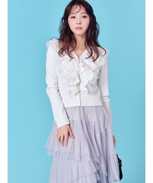 顔周りを華やかに演出するフリルニットカーディガン。チュールを重ねることで奥行きのあるデザインに仕上げました。身頃はリブ編みで伸縮性も抜群のため体に心地よくフィットします。カーディガンを主役にシンプルなボトムスとのコーディネートがおすすめ。透け感:なし裏地:なし伸縮性:あり光沢感:なし生地の厚さ:中肉※照明の関係により、実際よりも色味が違って見える場合があります。またパソコン・スマートフォンなどの環境により、若干製品と画像のカラーが異なる場合もございます。予めご了承ください。商品の色味は、商品単品画像をご参照下さい。 ※商品画像はサンプルのため、色味やサイズ等の仕様に変更がある場合がございますので、予めご了承ください。