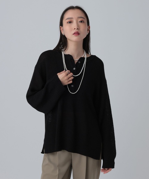 清涼感がある素材のニットプルオーバー 【デザイン】 ドライタッチな糸を使用し、ポコポコと凹凸のあるカノコ編みで仕上げた1枚です。 ネックはトレンドのヘンリーネックで、開きすぎていないので安心感も◎ ボタンを開けてスキッパーのように抜け感を出す着方も可能です! 【スタイリング】 ・淡いデニムとのヘルシースタイルから、スカートとの甘辛MIXスタイルもおすすめです。
