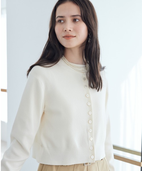 【肩掛けスタイルにもおすすめ。リッチなシェルボタンで着こなしに差がつく、コンパクト丈のニットカーデ】 【Design/Styling】 今年らしくコンパクトな丈感に仕上げたカーディガンは、前立てに贅沢なシェルボタンを使った、ラグジュアリーな逸品。 シェルボタンの印象が華やかですが、ベーシックなデザインとコンパクトシルエットで、上品にまとめているのもポイント。コーディネートのワンポイントとして、気軽に取り入れやすい一枚です。 前立てのボタンデザインを生かして、アシンメトリーな肩掛けスタイルで着るのも、今っぽいスタイリングです。 プリーツスカートニットドッキングOP(09WNO261008)と、合わせて着こなすのもおすすめ。 【Fabric】 コットン52%の、心地よさと丈夫さを兼ね備えたニット地。肉厚でハリとツヤ感があり、上質でエレガントな着こなしが可能です。 カラーは4色をご用意。<IVR>、<BLK>、<RED>、<MIX>で展開しています。 【本体】 透け感:なし 裏地:なし 伸縮性:あり 生地の厚さ:薄い ※照明の関係により、実際よりも色味が違って見える場合があります。 またパソコン・スマートフォンなどの環境により、若干製品と画像のカラーが異なる場合もございます。予めご了承ください。 商品の色味は、商品単品画像をご参照下さい。 ※商品画像はサンプルのため、色味やサイズ等の仕様に変更がある場合がございますので、予めご了承ください。