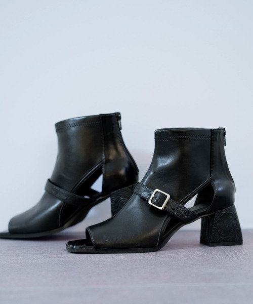ーーーヒールとベルトがエンボスになったブーツサンダルーーーpoint□トゥとサイドの程よい空き具合で1年を通して長く履けるシューズ□サイドカットと太ベルトが映えるデザイン□程よいスクエア型で上品さとモードさがある□安定感のある太ヒールで長時間着用できるstylingフレアスカートやワンピースを合わせると女性らしさの中にモードさがプラスされます。ブーツとしてもサンダルとしても使えるのでソックスを合わせて履いても素足で履いてもシーズンレスでお使いいただけます。※加工を施した画像を使用しております。実物と色味が異なる可能性があるため、色味は詳細後ろにある生地寄り画像を参考にお願いいたします。あらかじめご了承下さい。