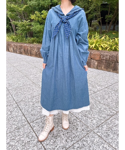 さらりと着やすくて、そして清楚で可愛いセーラーカラーのワンピース。春らしいダンガリー素材で登場です。 カラーと、カラーを縁取るラインは身生地と同系色をチョイスしているので、身ごろに馴染んでナチュラルな印象に。 ネップの極端に少ない糸を使用して織り上げたダンガリー素材は、柔らかくてとても着心地のよい素材感に。 「水玉プリント」のスカーフ付き。スカーフは身生地と同系色のものをそれぞれセレクト。 ポルカドットのスカーフをプラスするだけで、クラシカルな雰囲気に仕上がります。 スカーフは、外して他のアイテムやコーディネイトにプラスしてみても。 スカーフを外しても、ワンピースはタック使いのデザインと、3つ縦に並んだくるみボタンがなんとも可愛らしい。