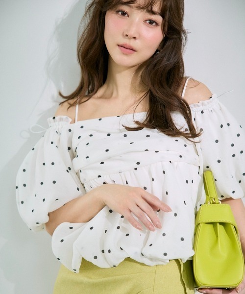 WEB限定アイテム【ハンドウォッシャブル】【大人気のブラウスがドット柄で再登場】【Design/Styling】人気を博した3wayブラウスを、WEB限定でトレンドムード漂うドット柄に。たっぷりとしたボリュームのパフスリーブは、肩に乗せても、オフショルダーにもできるデザイン。袖山に施したシルバーのストッパーで、肩周りのサイズ調整も叶います。さらに袖はボタンで取り外し可能なので、ペプラムキャミソールとしても着用可能です。全体のシルエットは、トレンドのバルーン調。短めの丈感で脚長効果もあります。また、肩のドロスト部分にメタルのパーツを使うなど、フェミニンなアイテムにスポーティーなテイストをプラスしています。手洗い可能なのでご自宅でのお洗濯もしやすく、春夏にうれしい一枚です。※照明の関係により、実際よりも色味が違って見える場合があります。またパソコン・スマートフォンなどの環境により、若干製品と画像のカラーが異なる場合もございます。予めご了承ください。商品の色味は、商品単品画像をご参照下さい。 ※商品画像はサンプルのため、色味やサイズ等の仕様に変更がある場合がございますので、予めご了承ください。