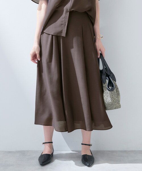 【デザインポイント】ご好評いただいているエアリーなローン素材を使用したスカートを新しいデザインでアップデートしました。ウエストのタックデザインで腰回りはすっきりとみせ、裾にかけて広がるフレアシルエットは女性らしさがあり軽やかに見せてくれます。【スタイリングポイント】同素材ブラウス(127-85402,85403)とのワンピース風スタイリングはトレンド感がありおすすめです。コンパクトなカットソーやニットと合わせていただくとバランス良くまとまります。【セットアップアイテム】長袖ブラウス:127-85402半袖ブラウス:127-85403スカート:127-75403【素材ポイント】シルキーな光沢のあるスパンタッチのナチュラルな風合いが特徴のローンになります。程よいシア―感がある軽くて涼しげな着心地に、シワになりにくく、通気性を兼ね備えた素材になっております。【仕様】・ポケットなし・左脇ファスナー・ウエスト後ろゴム・裏地あり※ホワイト(303)はやや透け感があります。※照明の関係により、実際よりも色味が違って見える場合があります。また、パソコン・スマートフォンなどの環境により、若干製品と画像のカラーが異なる場合もございます。モデル情報:身長170cm B74 W60 H86 着用サイズ:38(M)店舗へのお問い合わせ商品番号:127-75403●製品寸法:05(XXS):W59cm H97cm 総丈75cm13(LL):W78cm H115cm 総丈83cm15(3L):W82cm H119cm 総丈83cm19(5L):W90cm H127cm 総丈83cm36(S):W64cm H101cm 総丈78cm38(M):W67cm H104cm 総丈80cm40(L):W70cm H107cm 総丈82cm備考: