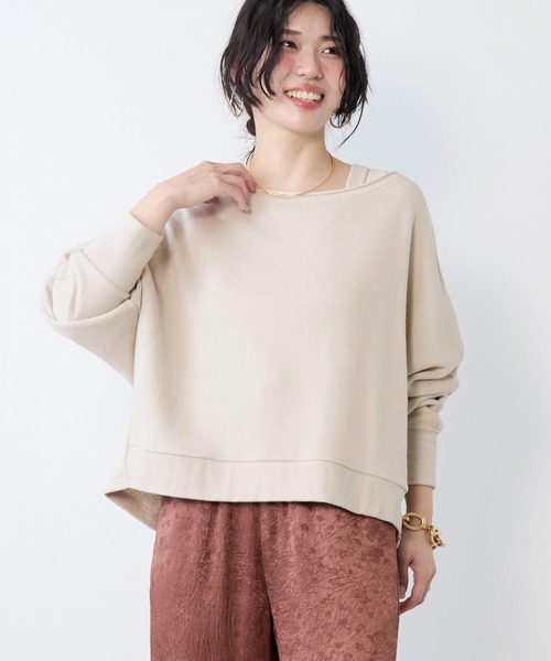 襟ぐりが大きく開いたドルマンスリーブのプルオーバー。 カジュアルな素材感と女性らしい肌見せのバランスが魅力的。 襟ぐりは断ち切り仕様ででラフさを出しています。 襟ぐりの開きが気になる方は、同じ糸で作ったのリブタンクトップを合わせて着ていただければアンダーウェアの肩紐を気にせずご着用いただけます。 オフショルダーで女性っぽく着こなすのがおすすめです。 【fabric】 綿/レーヨン/リネンの糸を使用したカジュアルながらもどこか品のある裏毛素材です。 ソフトでふくらみのある風合いが特徴。 -------------------------------------- 透け感:なし 裏地:なし 伸縮性:あり 光沢感:なし 生地の厚さ:普通 --------------------------------------水洗い可 *詳しくは商品の洗濯表示にてご確認をお願い致します。 【coordinate】 身幅が広いため、ボトムスにボリュームのあるワイドパンツを合わせると、バランスの良い着こなしになります。 カジュアルな裏毛素材のトップスを、あえてエレガントなロングスカートと合わせることで、トップスのカジュアルさとスカートの女性らしさが組み合わさり、こなれ感を演出。 オフショルの肌見せで女性らしさを出しつつ、デニムでカジュアルダウンさせた着こなしも。 ゆったりとしたシルエットは体型カバーにもなり、ボトムス次第で様々な雰囲気を楽しめます。 こちらの商品はアンサンブルとしてもお楽しみいただけます。 リネンブレンドテレコリブタンクトップ ※こちらの商品は、デザイン上一部を裁ち切り状態にしています。 そのため着用や洗濯を繰り返すことにより、ほつれることがあります。 予めご了承ください。 ※こちらの商品は麻を使用しております。表面に織フシ(太い線上のもの)や毛羽立ちや生成り色等の繊維くずが見られる場合がありますが、素材の特徴としてご理解ください。 ※商品画像はできる限り実物の色に近づけるよう徹底しておりますが、お使いのデバイスのモニター設定、お部屋の照明等の閲覧環境により実際の色味と異なって見える場合がございます。 ※画像の商品はサンプルです。実際の商品と仕様、加工が若干異なる場合があります。予めご了承くださいませ。 ▼商品のお気に入り登録 お気に入りアイテムの値下げ・再入荷・在庫1点などの通知を受け取ることができます。 ▼ブランドのお気に入り登録 新商品や再入荷、クーポン配布などのお得な情報を受け取ることができます。