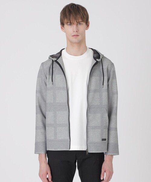 【カラミ織り素材を使用した軽量オトナパーカー】全面にシャドーのチェック柄をあしらったパーカー。メランジ調のカラーリングと程良いハリ感によりオトナなテイストのパーカーに仕上げています。フード裏にあしらったチェックや光沢感あるファスナーなど細かな部分にもこだわった一着です。素材にはシャドーのクレストブリッジチェック柄をプリントしたオリジナルカラミ織り素材を使用しています。特殊な染色技術を用いた糸を組み合わせることによって深みのあるメランジカラーに仕上げています。また、非常に軽量でありながら仕立て映えのする張り感もあり、表面の凹凸による清涼感、カラミ織り組織特有の高通気性が特徴の素材です。