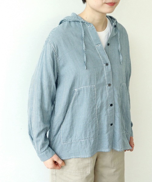 スタイリングの幅が広がるカジュアルなフードブラウス。 細めの糸で織り上げた、ソフトで肌馴染みの良いダブルガーゼ素材を使用。通気性に優れ空気をはらんで着映えする生地は、気温が高い日の日除け対策にも重宝します。なめらかなオーガニックコットンを使ったホワイトと、適度に落ち感のあるブルーのカラー展開。 紐の通ったフードやタックが入ったやや太めの袖、カンヌキがさりげなく入ったパッチポケットなど、ディテールにこだわりブランドらしい一着に。ゆったりと身幅のあるサイジングなので、フロントのボタンを留めてアノラックのように着るのもおすすめです。 ジャケットなどのかっちりとしたアイテムと合わせてカジュアルダウンしたり、カットソーの上にばさっと羽織っても程よい抜け感が出ます。同素材でノーカラーブラウス(5001BL010261)もご用意しております。 ※ホワイトは後日販売開始致します。 -------------------- 透け感:ホワイトのみややあり 裏地:なし 伸縮性:なし 光沢感:なし ポケット:あり -------------------- 【素材の特性・お取り扱いの注意】 ・取り扱いの注意については取り扱い表示をよくご確認の上、着用をお願い致します。 ・デリケートな素材を使用しており、風合いを出す為、織りが甘くざっくりとした仕上がりになっております。力が加わる部分はスリップ(縫い目から生地の織り目が開くこと)が起こりやすい為、着脱の際はご注意下さい。 (ホワイト) ・風合いを保つ為、お洗濯の際は軽く押し洗い後、速やかに形を整えて干して下さい。強く洗うと風合いが変わりますのでお避け下さい。多少伸縮する可能性がありますのでご了承下さい。 ・直接日光や蛍光灯に長時間当てると変色する可能性がありますので、保管時はご注意下さい。また、色褪せ変色は経年変化によるものですのでご了承下さい。 (ブルー) ・指定外繊維(テンセル)を使用しております。吸湿性に優れていますが、お洗濯により型崩れ・しわになりやすい性質があります。摩擦(特に湿った状態)に弱く、白っぽく毛羽立つことがありますので、お洗濯の際は裏返して速やかに押し洗い後、放置せずに形を整えて吊り干しして下さい。 ※撮影画像は、光の当たり具合やモニターの環境により色味が違って見える場合があります。あらかじめご了承下さい。 ※ブルーの画像はサンプルを着用しています。お届けする実際の商品と仕様、加工、サイズが若干異なる場合があります。 サンプルの画像から肩幅が3.5cm、裾幅が4cm広くなります。