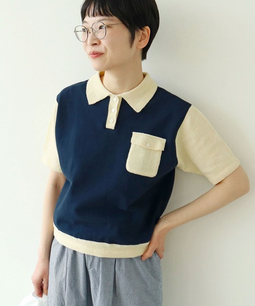 ニットとカットソーを部分的にドッキングさせたポロシャツ。身頃はざっくりとしたかのこ編みのカットソーを使用し、立体感のあるデザインに。身頃以外は、糸の周りにカールしたループがついたファンシーヤーン糸で編み立てたニットを使用。ふくらみのある軽やかな生地に仕上げました。どこか遊び心を感じるふわふわとした印象の糸ですが、程よくシャリ感があり通気性に優れています。ボディラインを拾わないゆとりのあるシルエットながらも、裾を出してすっきりと着られるバランス。カジュアルすぎない印象なので幅広いスタイリングで活躍します。ネイビーにはアイボリーの配色、アイボリーとブラックは微配色の組み合わせです。シンプルな中にも生地や編地にこだわった一枚。チノパンツやデニムなど、ベーシックボトムとの相性抜群です。柄物のスカートを合わせて可愛らしさをプラスした着こなしもおすすめ。同素材でベスト(5001KN006261)もご用意しております。※アイボリー、ブラックは後日販売開始致します。--------------------透け感:なし裏地:なし伸縮性:ややあり光沢感:なしポケット:あり--------------------【素材の特性・お取り扱いの注意】・取り扱いの注意については取り扱い表示をよくご確認の上、着用をお願い致します。・直接日光や蛍光灯に長時間当てると変色する可能性がありますので、保管時はご注意下さい。また、色褪せ変色は経年変化によるものですのでご了承下さい。・洗濯機でお洗濯の場合はドライコースでお願い致します。洗濯機にドライコースがない場合は、ネットに入れて優しく手洗いして下さい。脱水は洗濯機を使っても構いませんが、遠心力が強すぎると変形や歪みの原因になりますので、脱水時間を3~5分以内で止めて下さい。脱水後は変形しやすいので、速やかに形を整えて日陰に平干しして下さい。(ネイビー)・配色のデザインを重視した商品の為、色移りの可能性があります。・お洗濯の際、摩擦により淡色部分に色移りする場合がありますので揉み洗いは避け、押し洗いでお願い致します。・色移りを防止する為、単独洗いでも濡れたまま放置せず速やかに脱水・乾燥して下さい。必ずネットに入れ、シミが付いた場合の浸け置き洗いは10分以上放置しないで下さい。・濡れた状態で強く擦られた場合、他の衣料に移染する事がありますので、淡色のインナーやボトム等と合わせる際はご注意下さい。※撮影画像は、光の当たり具合やモニターの環境により色味が違って見える場合があります。あらかじめご了承下さい。※ネイビーの画像はサンプルを着用しています。お届けする実際の商品と仕様、加工、サイズが若干異なる場合があります。