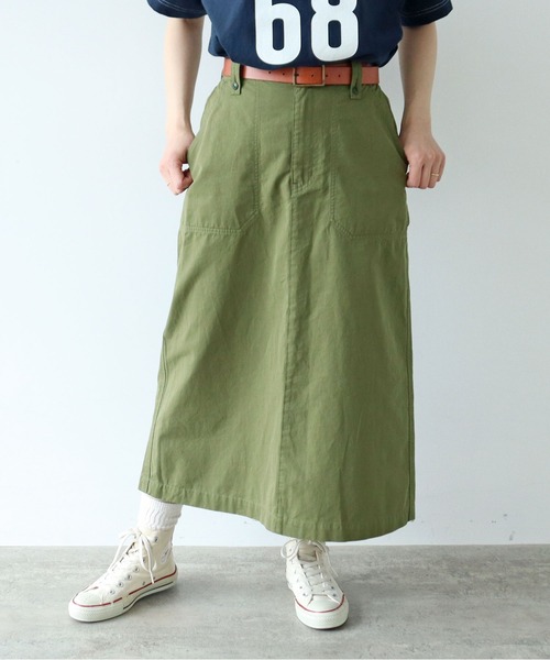 ハリとコシがあり、耐久性に優れた生地で作ったワークスカート。通常のツイル素材よりも糸を高密度に織り込んだ生地は、丈夫でありながらも気兼ねなく着られる適度な厚み。軽い素材感で女性が履きやすいメンズライクなボトムを目指しました。メンズライクなカーキと、どこかこなれた古着のような風合いのネイビーをチョイス。大きめのポケットやハンマーループなど、ワークディテールをふんだんに取り入れ、ブランドらしい一着に仕上げました。ウエストは後ろのみゴム仕様でラクに履けて、ウエスト周りが綺麗に見えるデザインが嬉しい。季節問わず着回しの効くアイテムで、ボーダーカットソーや白シャツと合わせるとフレンチミリタリーにはまる一着。フリルブラウスなどの甘めアイテムと合わせて、程よくかわいらしいスタイリングもお楽しみいただけます。同素材でパンツ(5001PT007261)もご用意しております。※ネイビーは後日販売開始致します。--------------------透け感:なし裏地:なし伸縮性:なし光沢感:なしポケット:あり--------------------【素材の特性・お取り扱いの注意】・取り扱いの注意については取り扱い表示をよくご確認の上、着用をお願い致します。・素材の性質上、色落ちする恐れがあります。特に雨や水等に濡れた時や強く擦られた場合に色落ちし、他の衣類に移染することがあります。・お洗濯の際は単独洗いでお願い致します。・白及び淡色のもの(衣類、下着、靴下、バッグ、自動車のシート、ソファー等)摩擦により色移りする可能性がありますので、ご注意下さい。・強い日光(又は照明)を長時間受けますと変色の恐れがありますので、洗濯後は裏返しにした状態で日陰で陰干しをお願い致します。※撮影画像は、光の当たり具合やモニターの環境により色味が違って見える場合があります。あらかじめご了承下さい。※カーキの画像はサンプルを着用しています。お届けする実際の商品と仕様、加工、サイズが若干異なる場合があります。サンプルの画像から総丈が2.5cm長くなります。