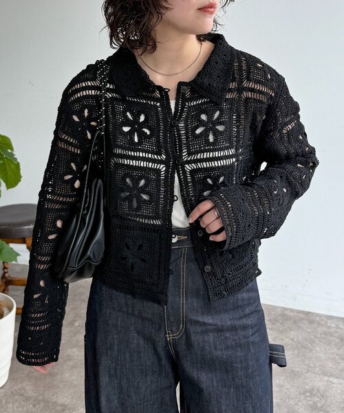 主役級の存在感!繊細なクロシェ編みが魅力の襟付きカーディガン 繊細なクロシェ編みが、どこか懐かしくも新しい雰囲気を演出する襟付きカーディガンです! 綿100%のさらりとした肌触りで、インナー次第でロングシーズン着回しを楽しめます◎ 【POINT】 ・ヴィンテージ感あふれる、表情豊かなクロシェ編みデザイン。 ・レイヤードが楽しめる透け感と、着こなしの幅が広がる襟付き仕様。 ・羽織でも着やすい、ほどよくゆとりのあるシルエット。 【STYLING】 ・インナーにキャミソールやタンクトップを合わせ、ワイドなカーゴパンツやデニムと組み合わせたリラックス感のあるカジュアルスタイル。 ・スラックスやストライプ柄のパンツと合わせて、少しきれいめな印象に。インナーをブラックにすると、柄が際立ちシックな雰囲気に仕上がります。 【KEYWORD】 春服 ※生産の都合上、お届け時期が前後する場合がございます。ご注文いただいた予約商品のお届け時期の確認は、注文履歴ページより行えます。 ※個体差があるため、サイズが1~2㎝程異なる可能性がございます。 ※お色物は色移りする可能性がございます。着用、お取り扱いは商品についておりますアテンションタグを必ずご確認ください。 ※商品画像はサンプル品を使用しているため、実際の商品と仕様、加工、サイズが若干異なる場合がございます。また、可能な限り実物に近いカラーにて掲載していますが、使用しているパソコンのモニター設定や、 携帯電話のメーカー・機種により実際のカラーと異なって見える場合がございます。予めご了承ください。 *********************** 商品の特徴 透け感:なし 裏地:なし 伸縮性:なし 光沢感:なし 生地の厚さ:普通 洗濯・取り扱い 洗濯:液温は40 ℃を限度とし、手洗いができる クリーニング:非常に弱い操作によるウエットクリーニングができる タンブル乾燥:タンブル乾燥禁止 アイロン:底面温度120 ℃を限度としてアイロン仕上げができる ***********************