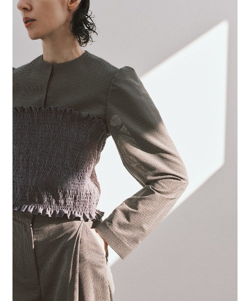 Houndstooth Karami Stretch Short Jacket メッシュのような清涼感を備えた、からみ織り生地のショートジャケット。肩口に寄せたギャザーが立体的なボリュームスリーブを描き出し、タイトな身頃とのコントラストで上半身をより華奢な印象へと導きます。身体に程よく添うコンパクト設計と、腰位置を高く見せる絶妙な短丈バランスが、どんなボトムスとも美しく調和。クラシックな気品と現代的な抜け感が調和した、夏の主役級ジャケットです。 【生地】 通気性に優れ、驚くほど軽やかな着心地を実現したからみストレッチ素材。クラシックなハウンドトゥース柄を、奥行きのあるシアーな質感で仕上げたモダンなファブリック。優れたストレッチ性に加え、ご自宅で洗濯可能なウォッシャブル性も備えた機能面も優秀な素材です。 【CIS.(シス)】 絶大な支持を誇るファッションディレクター、黒石奈央子氏を迎えたブランド。 2026春夏シーズンテーマは"SUNLIT FRAME"~光に輪郭を与える服~。陽射しが織りなす光と影のコントラストの中で、佇まいに静かな強さを描くコレクション。素材の質感を活かしながら、構築的なフォルムで軽やかさと輪郭を両立したアイテムをお届けします。 *セット着用可(パンツは別売りとなります。) パンツ:S6508P1 【仕様】ノーカラー/フロントフック5つ留め/背抜き仕立て/筒袖 【洗濯表示】ドライクリーニング・家庭洗濯可《洗濯機可(ネット使用・弱水流)》 ※同サイズまたは同一商品でも、生産の過程で1.0cm~2.0cm程度の個体差や着用感の違いが生じる場合がございます。 ※カラー名は管理用の表記となります。実際の商品の色味は商品画像をご確認ください。 ※商品画像はできる限り実際の色に近づけて掲載しておりますが、パソコン環境により色味に誤差が生じる場合がございます。予めご了承下さいませ。