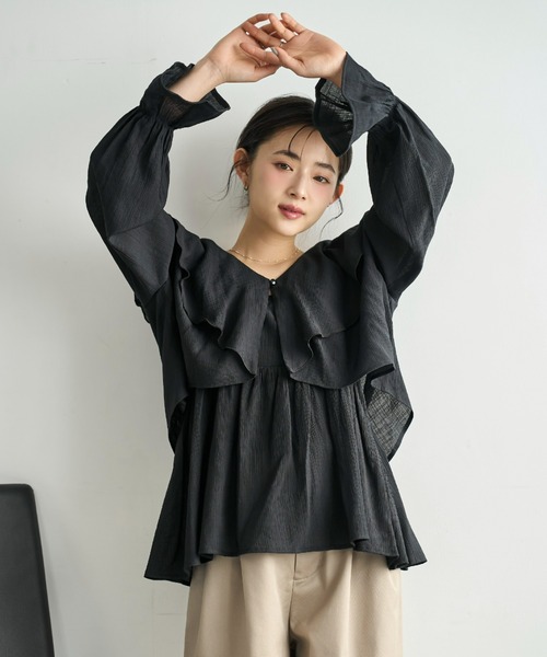 ひらりと揺れるラッフルが目を惹く、 キャミソール×ボレロのセットブラウス。 シボ感のある軽やかなシアー素材が、動くたびにやさしく揺れ、纏うだけで女性らしい表情と着映えを叶えてくれます。 ラッフルデザインが顔まわりを華やかに見せつつ、どこか落ち着いた甘さで、大人にも取り入れやすい一着。 ボレロは羽織るだけでスタイリングに奥行きをプラス。セットでも、単品でも着用できるマルチway仕様で、コーディネートの幅が広がります。 カラーは、シックなブラック、やわらかなアイボリー、ニュアンス感のあるモカの3色展開。 纏うだけで、装いも気分もふわりと華やぐブラウスです。 キャミソール ・後ろゴム仕様 ・肩紐調整可能 ボレロ ・フロントループボタン仕様 ◆Fabric◆ ・とろみのある肌触りの素材。 ◆Styling◆ ・マーメイドスカートを合わせ、素材の揺れ感を活かしキャミソールをインして短丈を強調すれば、脚長効果抜群の気品ある装いに。 ・ワイドデニムで甘さを抑え、トップスのとろみ感とデニムのラフな質感の対比が、洗練されたミックススタイル。 ・センタープレスのスラックスと合わせ、少し襟を抜いて着ることで、素材の高級感を引き立てる都会的な印象に仕上がりに。 ~~~~~~~~~~~~~~~ 裏地 なし 生地の厚み 薄手 生地の透け感 あり 生地の伸縮性 なし 生地の光沢感 少しあり ~~~~~~~~~~~~~~~ ※染色・加工条件により色ごとの風合いに多少の差異が生じる場合がございます。品質に問題はございませんので予めご了承ください。 ※素材によってはやむを得ず染料や防カビ剤等、脱色による塩素の匂いが強いものがございます。 また、素材にアクリルを使用している場合は石油が原料の化学繊維のため、匂いに敏感な方はその匂いを感じてしまう事もございます。 臭いが気になる場合は水洗い・または陰干しされてからご着用いただくようお願いいたします。 ※大量生産のため糸始末が十分なされない場合がございます。気になる場合は出ている糸をはさみ等でお切りください。 ※画像の商品はサンプルのため、実際の商品とは色味・仕様・加工・サイズ等が若干異なる場合がございます。 ※商品によっては、2cm前後(ニットの場合は3cm前後)のサイズ誤差が生じる場合がございます。 ※撮影時の照明やお使いのパソコン・スマートフォンの設定等により画像の色が実物と異なって見える場合がございます 【mil/ミル】 低身長でもオシャレを楽しみたい そんな気持ちから生まれた 小柄さん向けレディースブランド。 ぴったり丈の感動をお届けします。 around150cm Produce by @chiii.yyy 【ブランド公式SNS】 Instagram: @mil_by.chiii 《お気に入り登録》でお得な情報がいっぱい ・「商品のお気に入り登録」で再入荷通知や、ラスト1点の通知、セール通知も受け取ることができます。 ・「ブランドのお気に入り登録」で新商品や再入荷など、お得な情報を受け取ることができます! ※ご注文いただいた予約商品のお届け時期の確認は、注文履歴ページより行えます。 ※他のキャンペーンにより、期間中に価格が変動する場合があります。 ※セールは予告なく終了させていただく場合もあります。