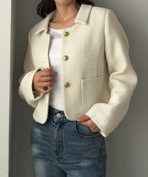 【Louere / ルエレ】 上品×クラシカルが叶うラメツイードジャケット。 ■detail キラキラと煌めくラメツイード生地を贅沢に使用したジャケット。スタイルUP効果を発揮してくれるショート丈なので さまざまなボトムスと合わせやすく、着回し力抜群! 金ボタンはLouereのロゴ入りになっているのもこだわりポイント♡ かちっとしたステンカラーが羽織るだけでコーデをきれいめにまとめてくれる上品itemです。 ■fabric 上品なラメ入りツイード素材。 ………………… 透け感:なし 厚さ:普通 伸縮性:なし 裏地:あり シワ:なりにくい 推奨シーズン:9月~10月、3月~4月 ※関東の平均気温を目安に推奨シーズンを記載しております。 ………………… ※詳しいお手入れ方法は商品タグをご参照ください。 Louereのサイズ展開は低身長から高身長、 大きいサイズまで幅広い体型の方にご着用頂けるようサイズ間の寸法差を工夫しています。 詳しくはサイズ詳細をご覧ください。 【必ずご確認の上、ご検討ください】 ・通販の特性上、到着時には畳みシワが必ずございますのでご了承ください。 ・掲載している画像はできる限り実際の商品に近づけておりますが、モニター環境や照明等により、実際の色味と異なる場合がございます。 ・商品画像は撮影時の光や角度により、実物の色味と異なって見える場合がございます。 ・撮影はサンプル品を使用しており、表示のサイズ感も実物とは若干異なる場合がございますので、予めご了承ください。 ・生産時期により色・素材・サイズ感など多少異なる場合がございます。予めご了承ください。 ・濃色製品は、摩擦(特に湿った状態での摩擦)や、汗・雨などで濡れた際に他の衣料やバッグなどに色移りする場合がございます。淡色・白物との組み合わせや重ね着の際はご注意ください。 ・洗濯の際は、他の衣類と分けて単独で洗ってください。淡色・白物と一緒に洗うと色移りする恐れがあります。 ・洗濯の際はネット使用をおすすめいたします。漂白剤のご使用はお避けください。 ・タンブラー乾燥(乾燥機の使用)は、生地の縮みや型崩れ、風合いの変化の原因となるためお避けください。 ・素材の特性上、洗濯や着用により多少の縮み・ゆがみが生じる場合がございます。 ・天然素材(綿・麻・ウールなど)を使用している商品は、繊維の特性上ネップ(糸の節)や多少の織りムラが見られる場合がございますが、素材の風合いとしてお楽しみください。 ・ダメージ加工やウォッシュ加工が施されている商品は、1点ごとに風合いや色の出方が異なります。製品の特性としてご理解ください。 ・商品生地の特性により±1~2cm(ニット製品は±1〜3cm)程度の誤差が生じる場合がございます。 ・着用感には個人差がございます。サイズ表記は目安としてご参考ください。 ・プリント・刺繍・装飾のある商品は、摩擦や洗濯により多少のはがれ・毛羽立ちが生じる場合がございます。お取り扱いにはご注意ください。 ・直射日光や蛍光灯の光に長時間当たると、変色・退色する場合がございます。保管の際は光の当たらない場所で保管してください。 ・返品・交換規定は当サイトのヘルプをご参照ください。 ★お買いものをよりお楽しみいただく為に!★ ▼商品のお気に入り登録 お気に入りアイテムの完売カラーの再入荷通知や、ラスト1点の通知、 セールの通知も受け取ることができます。 ▼ブランドのお気に入り登録 新商品や再入荷など、クーポン配布などのお得な情報を受け取ることができます。