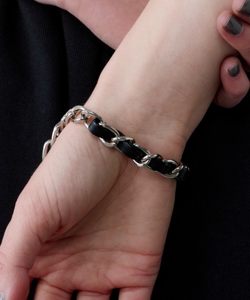 【AFF AIVER 編込みチェーンブレスレット MADE IN JAPAN】・2面カットのチェーンにフェイクレザーを編み込んだデザイン・レザー自体はしなやかで柔らかく仕上がり・2種類の素材を組み合わせ細身でもボリュームのあるブレスレット・レザーのないチェーン部分を約5cm取り付けているためその分サイズ調節可能・サイズ約17cm~約22cm対応・留め具にはナスカンを採用し止めやすい仕様・日本製・ブラック、ブラウン2色展開<スペック>全長(留め具ナスカン含む) 約22cmチェーン(調整可能部分) 約5cmナスカン(リング含む) 約3.2cm※サイズ目安です。<同じデザインで編込みチェーンネックレス(問い合わせ番号/FA00000068/FABNG261004)もあります。><問い合わせ番号/FA00000067/FABNG261003>【AFF AIVER/エイエフエフ アイバー】Anarchy / 51%realism主張がある中にも実用性を重視した表現する人の為の日常着a fucreation for AIVER※この製品は合成皮革、鉄、合金素材を使用しています。体質によっては、かゆみ・かぶれを生じることがあります。皮膚に異常を感じた場合は着用を中止し、専門医にご相談ください。※引っ掛けや強い力を加えるとチェーン切れの原因となります。※取り外しを繰り返していくうちに留め具部分が緩む場合があります。※汗や温泉成分などにより本体が硫化し変色の原因になります。お取り扱い扱いにはご注意下さい。※商品画像はサンプルの為、色味やサイズ等の仕様に変更がある場合があります。※画像つきましては、光の反射によって実物と色味が異なって見える場合があります。予めご了承下さい。<商品のお気に入り登録>再入荷、残り1点、セールなどの通知を受け取ることが出来ます。<ブランドお気に入り登録>新商品や再入荷、ショップのおすすめトピックスなど、いち早くブランドのお得な情報を受け取ることが出来ます。