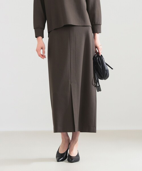 ■デザイン 縦のラインを強調するフロントの切り替えが、すっきりとした印象を与えるタイトスカート。装飾を抑えたミニマルなデザインが、大人らしい洗練されたスタイルに導きます。 ■コーディネート 同素材のプルオーバーと合わせた、Iラインのセットアップスタイルがおすすめ。ブラウスやジャケットを合わせれば、オフィスシーンにも映える知的な着こなしが完成します。 ■ディテール 足さばきの良さと、女性らしい抜け感を叶えるフロントスリット。ウエスト周りはフラットな仕様で、トップスをインしてももたつきにくい美しい仕上がりです。 ■サイズ 肉感を拾いにくい適度な厚さと、程良いフィット感が安心感のある穿き心地を演出。足首が見える上品な着丈で、ヒールはもちろんフラットシューズとも好相性です。 ■素材 布帛のように滑らかでクリアな表面感を持つ、伸縮性に優れたポンチ素材。嬉しいUVケア機能付きで、機能面も充実した上質なテキスタイルです。 ■ケア方法 手洗い可(詳細は商品についている品質表示ラベルをご覧ください) Model:H171 B80 W58 H86 Size:38 ********************** 生地の厚さ:やや厚手 透け感:なし 伸縮性:あり 光沢感:ややあり 裏地:なし ********************** ●同素材のトップスもございます 品番:64-14-0314-783 ※光の当たり具合やパソコンなどの閲覧環境によって実際の色味と異なって見える場合がございます。予めご了承ください。 ※商品の色味は商品単体で撮影した画像をご参照ください。