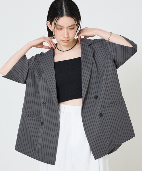 春夏に使える、軽やか素材の半袖ジャケット -Design- ハーフスリーブで抜けを作る、ダブル仕様の軽やかジャケット。 軽めのポリエステル素材で、春〜初夏の羽織りとして最適です。 ブラック(無地)とチャコールグレー(ストライプ)の2色展開。 身体を締め付けないゆったりサイズで、ラフに羽織ってもきちんと見える“エフォートレス”なバランスが魅力。 別売りの同素材パンツと合わせれば統一感のあるセットアップとしても着用可能。 オンオフ問わず使えるミニマルな表情で、大人のワードローブにすっと馴染みます。 -Cordinate- セットアップ推し:同素材パンツと合わせて“上下ワイド”の統一感を。ジャケットは前を開けて丈69cmがヒップをさりげなくカバーするバランスに。 デイリー抜け:リブタンク+ロングデニムでカジュアルに。ハーフスリーブ(袖丈35cm)が腕を軽やかに見せ、夏前の羽織りに最適。 オフィスの外し:白ブラウス+テーパードパンツでジャケットをワンボタン留めにし“きちんと感”とヌケを両立。素材の軽さで長時間の着用も快適。 ユニセックス着こなし:サイズを活かしてオーバーに着る“メンズライク”な着こなしも◎。キャップやスニーカーでストリートに振ると今っぽさUP。 \セットアップも楽しめる 同柄アイテムシリーズ/ タック ボリュームパンツ [商品番号:38523850000] ※チャコールグレーのみ フロントボタンオールインワン [商品番号:38523890001] ※チャコールグレーのみ ストライプワイドジャケット [商品番号:38513850002] レイヤード シャツ [商品番号:38523810001] ※チャコールグレーのみ 【注意事項】 ※商品画像は、光の当たり具合やパソコンなどの閲覧環境により、実際の色味と異なって見える場合がございます。あらかじめご了承ください。 ※画像の商品はサンプルです。 ※商品の色味の目安は、商品単体の画像をご参照ください。 ※商品を使用前に、タグ等に記載されている「取り扱い上の注意書き」「洗濯表示」を必ずご確認ください。 ※商品に不良が無い場合、包装紙および箱の破損がございましても発送いたします。あらかじめご了承ください。 ============== ▼商品のお気に入り登録▼ ♡をタップorクリック!完売カラーの再入荷や、ラスト1点の通知、セールの際の通知を受ける事ができます。 ▼ブランドのお気に入り登録 ▼ 新商品や再入荷など、ブランドのお得な情報をいち早く受ける事が出来ます。 ==============