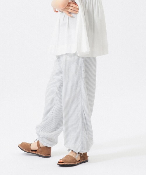 裾コードで変化自在!夏の涼感パンツ ■デザイン リラックス感のあるベーシックなイージーパンツ型に落とし込んだ夏らしい1着です。暑い季節でも締め付けを感じさせず、長く愛用できることを第一に考えて作製。裾に共生地の紐を通した仕様が特徴で、絞ることでシルエットに変化をつけ、異なるニュアンスを楽しめるデザインです。 ■コーディネート 同素材のノースリーブシャツ(品番:13-01-0604-803)と合わせた、統一感のあるナチュラルなセットアップスタイルがイチオシ。また、シンプルなTシャツやタンクトップを合わせた軽快なデイリースタイルにも馴染みやすく、裾のドローコードでサンダルやスニーカーに合わせてバランスを調整できるのも魅力です。 ■サイズ リラックスした着用感を叶える2サイズ展開。ウエストと裾の両方に共生地の紐が通されており、好みのシルエットに合わせて細かな調整が可能です 。 ■素材 コットンとリネンをブレンドした、軽く爽やかな風合いの先染め素材を採用しています。粗野なネップ感や程よいムラ感、ドライなタッチが特徴で、ナチュラルな表情を楽しみながら夏場も快適に着用いただけます。 ■ケア方法 手洗い可(詳細は商品についている品質表示ラベルをご覧ください) 【YELLOW】BEAMS STAFF:H159 Size:1 【BLUE】Model : H164 B72 W59 H85 Size : 1 ※アイテムサイズは商品サンプルを採寸しているため、実際の商品と多少の誤差が生じる場合がございます。 ※画像の商品はサンプルのため、実際の商品と「仕様」「色合い」が異なる場合がございます。