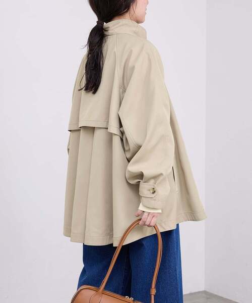 撥水加工/洗濯機洗い可能【2026SS】SLOBE IENAPOINT大好評につき追加生産が決定しました!※旧品番25020912300010、25020912302030、26020912302010の追加商品です。※若干の仕様変更がある場合もございます。★追加の人気POINT★*スタンドネックが可愛く、横からのシルエットも素敵*袖が太めで裏地付き、腕や肩周りもゆったり着られる*春秋の肌寒い日も活躍!スーツの上からも羽織れるミドル丈*お尻まで隠れる丈で体型カバーもできる ※いただいたレビューを参考に一部記載しております。ご登録いただきありがとうございます!【素材の特徴】撥水加工を施したツイル素材のコート。雨の日や突然の天気変化も安心。【デザイン】トレンチ風のきちんと感に、Aラインのポンチョ風シルエットでトレンド感をプラス。フロントを開けて大きめの襟のように着ることも可能です。袖口にカフスストラップが付いているので、お好みに合わせて袖口のサイズ感を調整できます。フロントのボタンを昨年より一回り大きくすることで、きちんと感と少しクラシックな印象に仕上げました。【コーディネート】フロントボタンを大きめにし、クラシックな印象ときちんと感を両立。袖口カフスでサイズ感の調整が可能。ミドル丈でパンツにもスカートにも合わせやすいです。デニムと合わせればカジュアル、襟を立てて着れば上品に◎。※こちらの商品はカラーによってアテンションが異なります。色あせ:ネイビーのみ※こちらの商品は、WEB限定商品です。店舗へは入荷致しませんのでお問い合わせの際にはご注意ください。**********************透け感:なし裏地:あり伸縮性:なし光沢感:なし生地の厚さ:普通**********************【スタッフ着用コメント】《スタッフ名:Yuka》年齢:20代後半/身長:172cm/体型:細身/普段サイズ:M~L/着用サイズ:フリーサイズ感:ヒップにかかる着丈。手首がしっかり隠れる袖丈。腕周りにかなりゆとりがあるので、中物問わず着やすい印象です。素材感:表面はややドライタッチなイメージです。裏地が付いているのでさらっと羽織りやすいです。着心地:ゆったりとしたサイジングなので、楽に羽織れました。**********************※取り扱いについては、商品についている品質表示でご確認ください。こちらの商品は、SLOBE IENAでの取り扱いになります。直接店舗へお問い合わせの際はSLOBE IENA店舗へお願い致します。※照明の関係により、実際よりも色味が違って見える場合があります。またパソコン・スマートフォンなどの環境により、若干製品と画像のカラーが異なる場合もございます。予めご了承ください。※商品の色味は、商品アップ画像をご参照ください。本体:洗濯機洗い(弱)