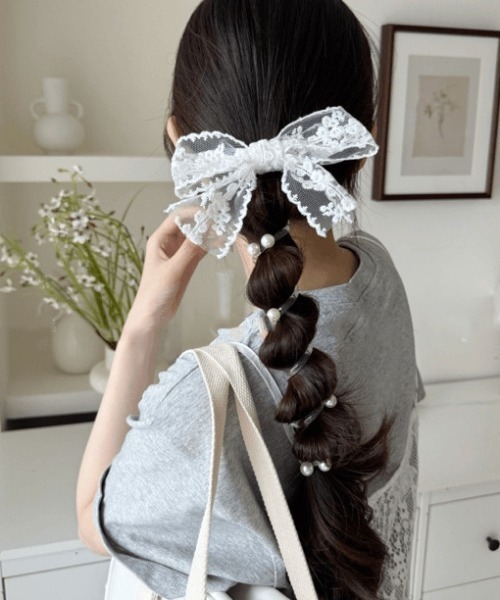 ■DETAIL繊細な総レースのビッグリボンが目を惹く、フェミニンなヘアワイヤー。リボンから続く透明なワイヤーにはパールが贅沢に散りばめられており、髪に巻き付けるだけでトレンドの「編みおろしスタイル」や「ポニーテールアレンジ」が簡単に完成します。ワイヤー入りなので形を自由に変えられ、自分好みのボリューム感に調整可能。 デイリー使いはもちろん、パーティーやイベント、浴衣スタイルなど華やかなシーンにもぴったりのアイテムです。■COORDINATE・シンプルなポニーテールに巻き付けて、一気に華やかなバックスタイルに。 ・三つ編みやロープ編みに沿わせて、韓国風のこなれ感を演出。 ・ハーフアップのアクセントとしてリボンを主役にしたガーリースタイル。 ・ガーリーなワンピースから、あえてカジュアルなデニムスタイルのハズしアイテムとしても◎ーーーーーーーーーーー【色展開】・ホワイト・ブラックーーーーーーーーーーー<着用レビュー> 【スタッフA】 ワイヤーが柔らかいので、不器用な私でも簡単に巻き付けられました!パールの光沢感が上品で、後ろ姿がパッと明るくなります。リボンが大きめなので、小顔効果も期待できそうです♡【スタッフB】 リボンのレースが繊細で高見えします。ワイヤー部分が透明なので、パールの粒が髪に浮いているように見えてすごく可愛い!ブラックなら大人っぽく、甘さ控えめで使えます。【スタッフC】 しっかりと長さがあるので、毛先までしっかりアレンジを楽しめます。結婚式のお呼ばれや、推し活のヘアメにも持っていきたい写真映え抜群のアイテムです!▼POINT ・ヘアアクセサリー ・ヘアワイヤー ・レースリボン ・パールアクセサリー ・韓国ファッション ・ガーリー ・フレンチガーリー ・ヘアメ・ヘアアレンジ ・オケージョン ・結婚式 ・お呼ばれ ・レース・春コーデ・26SS・26春夏・春夏▼商品について▼※着用身長によって画像イメージと異なる場合があります。※画像の商品はサンプルとなります。実際の商品と色味、仕様、加工、サイズ、素材等が若干異なる場合がございます。※商品の色味は、撮影場所や光あたり具合、お使いの端末により色味が違って見える場合がございます 。予めご了承の上ご注文下さい。▼お取り扱いについて▼※着用またはお取り扱いの際は、アテンションタグや洗濯ネームを必ずご確認ください。※濃いカラーの商品は素材の特性上、汗や水による色移り、色落ちの可能性がございます。※明るい色の下着やバッグ、その他アイテムとの摩擦、色移りにご注意ください。《 お知らせ 》▼商品のお気に入り登録お気に入りアイテムの値下げ・再入荷・在庫1点などの通知を受け取ることができます。▼ブランドのお気に入り登録新商品や再入荷、セール、クーポン配布などお得な情報を受け取ることができます。