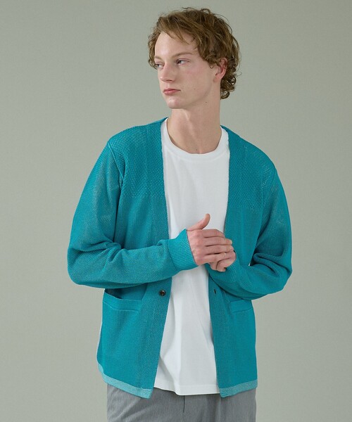 通気性と抜け感が際立つ大人カーディガンシアーな透け感が春夏に嬉しいメッシュカーディガン。着流しのようなミニマルな佇まいで、羽織るだけできれいめなスタイルが完成します。【素材】強撚レーヨン糸を使用した、春夏らしいドライなタッチが特徴。ナイロンストレッチ糸をカバーリングすることで伸縮性を持たせ、軽やかで快適な着用感に仕上げました。特殊なメッシュ構造により、裏表の配色がほのかに覗く奥行きのある色合いを表現。見た目の軽さと奥行きを両立した素材感です。【デザイン】ベーシックに合わせやすいレギュラーフィット。2種類のメッシュ編みを組み合わせることで表裏に色差が生まれ、奥行きのある表情に仕上げました。脇線には配色糸をテープ状に編み込み、リンキングで挟み込むことでさりげないアクセントをプラス。ポケット口や前立て裏の配色使いなど、細部にまでこだわりを感じる仕上がりです。着流しカーディガンのような雰囲気で、Tシャツの上にさらりと羽織るだけで様になります。【コーディネート】Tシャツやシャツの上から軽く羽織るだけで、季節感のある軽やかなスタイリングに。肩掛けすればアクセサリー感覚でこなれた印象を演出できます。デニムからスラックスまで幅広く合わせやすく、スマートに着回せる万能な一着です。**********************透け感:あり裏地:なし伸縮性:なし光沢感:なし生地の厚さ:やや薄手**********************