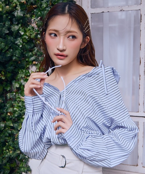肌見せも、安心感も。バランスで魅せるストライプブラウス インナーにベアトップをドッキングしたレイヤード仕様で、1枚でコーデが完成するストライプブラウス。ベアトップは表地のシャツと裾部分で縫い合わされており、自然な立体感を生む構築的なバルーンシルエットを実現します。オフショルダーデザインに、キャミソールを重ねたようなリボン付き肩紐を添えることで、程よい肌見せと安定感を両立。ベアトップ内蔵のため下着が見える心配がなく、透け感も気にせずこれ一枚で着用できます。縦ラインを強調するストライプ柄が甘さを抑え、REDYAZELらしいモード×ガーリーなバランスに。ミニスカートやフレアスカートで女性らしく、デニムやワイドパンツでカジュアルダウンも可能な、着回し力の高い一着です。 透け感:なし 裏地:あり 伸縮性:なし 生地の厚さ:薄手 F:ブラウス:着丈52cm 身幅63cm 肩幅53cm 袖丈47.5cm ベアトップ:着丈25cm 身幅30cm