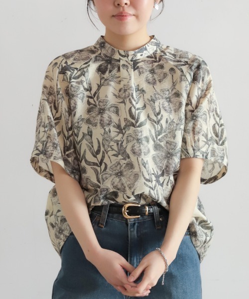 【NOMBRE IMPAIR ノンブルアンペール】2026 Summer Collection / pre order■一枚で決まる主役級ブラウスビッグプランツ柄が華やかなスタンドネックの6分袖ブラウス。繊細な植物モチーフとジャガード柄で奥行きのある表情に仕上げました。さらりとした軽やかな生地感と、ほどよいハリ感が上品な印象に。腕まわりをさりげなくカバーしてくれる6分袖デザインも嬉しいポイント。存在感がありながらも、落ち着いた配色なのでボトムスを選ばず着回せます◎■Coordinateデニムでカジュアルに合わせるだけで、ぱっと華やかな着こなしが完成します。ワイドパンツやきれいめスカートと合わせれば、きちんと感のある上品なスタイルに。1枚でもジャケットのインでも着用でき、ロングシーズン活躍する頼れるブラウス。洗濯:洗濯機使用可※画像の商品はサンプルです。実際の商品と色味、仕様、サイズ等が若干異なる場合がございます。※工場の生産の都合上、納期が変更になる場合がございます。発送日の前後については予めご了承ください。