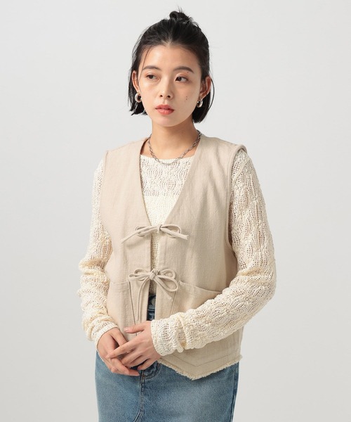 インナー次第で雰囲気が変わり、着こなしの幅が広がるリネンベスト ーーー ★おすすめポイント★ [1]春夏にぴったりなコットンリネン素材 [2]女性らしいリボンディテール [3]レイヤードもかさばらないサイジング [4]コンパクトなシルエット ーーー [fabric] コットンリネン素材に洗いをかけてラフな仕上がりに。 上品なツイル目のしっかりと厚みはある素材ですがさらっとした清涼感があり、春夏にぴったりの着心地。 [design] ヴィンテージのミリタリーベストをベースにリボンディテールで女性らしさをミックス。 アームホールにゆとりがあるので抜け感があり、レイヤードもかさばらないサイズ感。 フロントのリボンは結んでも、ラフにたらしても素敵なデザイン。 [styling] 春にはシャツやカットソー、ワンピースに重ねてもスタイリングに変化がでるアイテム。 夏はTシャツやタンクトップ合わせのシンプルでヘルシーなスタイリングがおすすめ。 【同素材のリネンアイテムはこちら】 リネンジャケット(638675) リネンパンツ(638680) ------------------------------------- ≪お買い物をよりお楽しみいただくために≫ ◆商品のお気に入り登録(ハートマークをクリック) 完売カラーの再入荷通知や、完売間近の通知、セールの通知も受けることができます。 ◆ブランドのお気に入り登録 新商品や再入荷など、いち早くブランドのお得な情報を受け取ることができます。 -------------------------------------