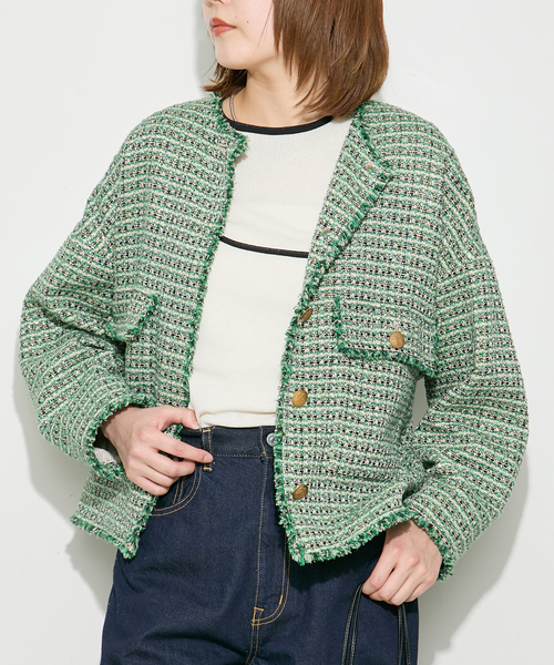 【2026 SS】 JOURNAL STANDARD L'ESSAGE ◆GIOLICATWEED ドルマンジャケットから新色が登場 イタリアのGIOLICA社の生地を使用したツイードジャケット。 ツイード調の素材感とゴールドボタンが、シンプルなスタイルに華やぎをプラスします。 程よいゆとりのあるシルエットで、デニムやワイドパンツと合わせれば、こなれた大人カジュアルに。オフィスから休日まで幅広く活躍する一着です。 ※ご購入のご注意※ こちらの商品は、素材の特性を活かし、生地の端をフリンジ状態にしているため、身生地糸がほつれてくることがあります。ほつれを止めるために、Wステッチを入れてますが、裁ち端部分から身生地糸が出てくる場合があります。その際は止まる位置で、はさみでカットして頂いて問題ありません。 予めご了承ください。 ********************** 透け感:なし 裏地:あり 伸縮性:なし 光沢感:なし 生地の厚さ:普通 ********************** 【スタッフ着用コメント】 《スタッフ K》 年齢:20代後半/身長:167cm/着用サイズ:フリー サイズ感:ゆったりとしたオーバーサイズ。腰くらいの着丈です。 素材感:上品なツイード素材。 着心地:かちっとしすぎずゆったりとしていて、ラクに着られます。 ********************** ※取り扱いについては、商品についている品質表示でご確認ください。 ※照明の関係により、実際よりも色味が違って見える場合があります。 またパソコン・スマートフォンなどの環境により、若干製品と画像のカラーが異なる場合もございます。 ※商品の色味は、商品アップ画像をご参照ください。 本体:ドライクリーニング