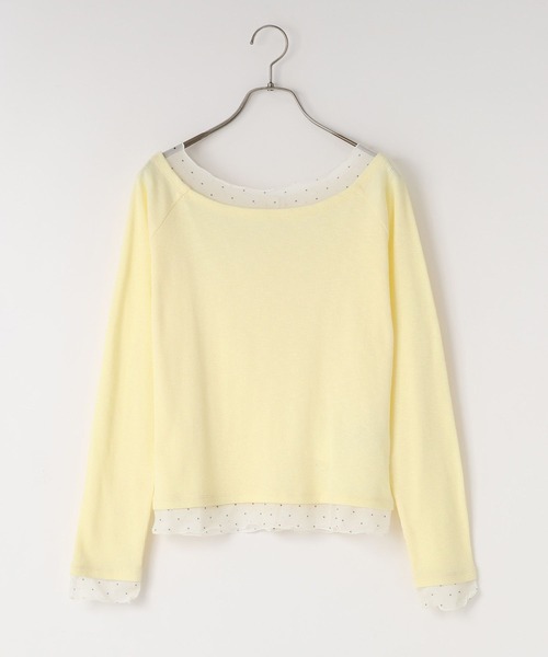 ■素材■スラブ糸を使用し、表情のある表面感と柔らかな風合いが特徴的なテレコ素材を使用しています。レイヤード部分はシアー素材を使用して抜け感をプラス。■デザイン■レイヤード風のデザインが今年らしいアイテムです。前後2wayで着用することができ、様々な着こなしができます。タイトすぎず、1枚で着やすいサイズ感に仕上げました。■スタイリング■パンツを合わせてカジュアルに着こなしたり、スカートを合わせて女性らしく着こなすのもオススメ。裾側のボタンを開けて少し抜け感をプラスしたり、肩をずらしてオフショルとして着てもかわいいです。
