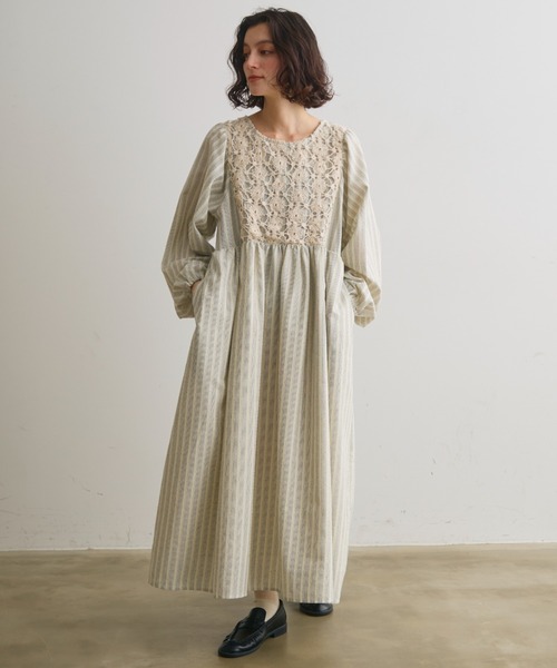 【胸元のレースデザインが目を惹くナチュラルワンピース】・レースとストライプを組み合わせ、ナチュラルな印象に仕立てたワンピース・ゆったりとしたラグラン袖とフレアシルエットがストレスフリーな着心地に・袖口はゴム仕様でふんわりとしたボリュームの出るデザイン・裏地付きで透け感の心配もなし○~スタイリング~1枚で春らしく、大人ナチュラルなかわいさのある印象に。肌寒さのある今の季節にはタイツやレギンスを裾から覗かせたりハイネックインナーを合わせたりも◎カーディガンを羽織るのもナチュラル感が増しおすすめ◎繊細なレースやふんわりとしたシルエットがCrispらしい1枚です。- - - - - - - - - - - - - - - - - - - - - - - - - - - - - - - - - 透け感:なし厚さ:薄手光沢感:なし伸縮性:なし裏地:ありポケット:あり仕様:後ろボタン開き洗濯:自宅洗濯可能(ネット使用推奨)- - - - - - - - - - - - - - - - - - - - - - - - - - - - - - - - - ※着用、お取り扱いの際は、商品についている品質表示とアテンションタグを必ずご確認下さい。春服/大人ナチュラル/ロングワンピース/花柄ワンピース/ストライプ柄/ストライプワンピース