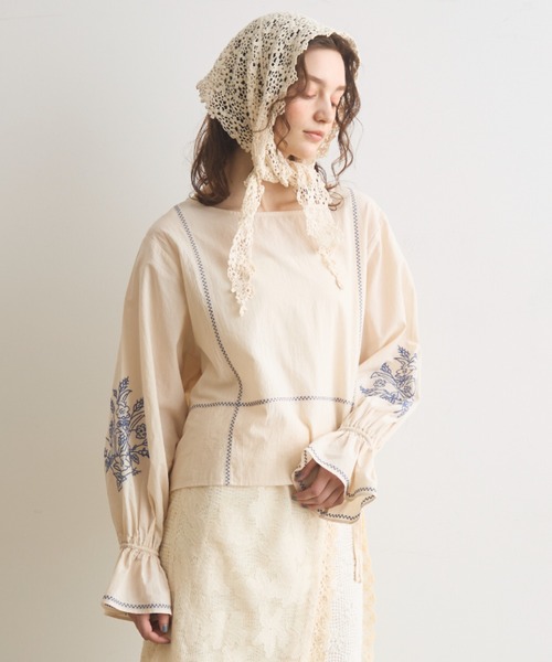 【目を惹くフラワー刺繍と軽やかな着心地が春らしい刺繍ブラウス】 ・ヴィンテージのテーブルクロスをベースにデザインした、身頃と袖に施したバイカラー刺繍がポイント ・緩く開いた首元で抜け感を出し、リラックスムードに ・ボリューム感のある袖はゴムを通したキャンディスリーブで着やすさも○ ・コットンの軽い素材感が春夏にぴったりな爽やかさのある1枚 ~スタイリング~ 1枚でさらっと着こなすのはもちろん、ハイネックインナーとのレイヤードを楽しむのもおすすめです。 デニム合わせで大人カジュアルに着るのはもちろん、レーススカートとレディライクに着るのも◎ コーデの主役になる花刺繍が春らしさ感じる1枚です。 - - - - - - - - - - - - - - - - - - - - - - - - - - - - - - - - - 透け感:ややあり 厚さ:薄手 光沢感:なし 伸縮性:なし 仕様:後ろボタン開き 洗濯:自宅洗濯可能(ネット使用推奨) - - - - - - - - - - - - - - - - - - - - - - - - - - - - - - - - - ※着用、お取り扱いの際は、商品についている品質表示とアテンションタグを必ずご確認下さい。 春服/刺繍ブラウス/大人ナチュラル/淡色/キャンディスリーブ