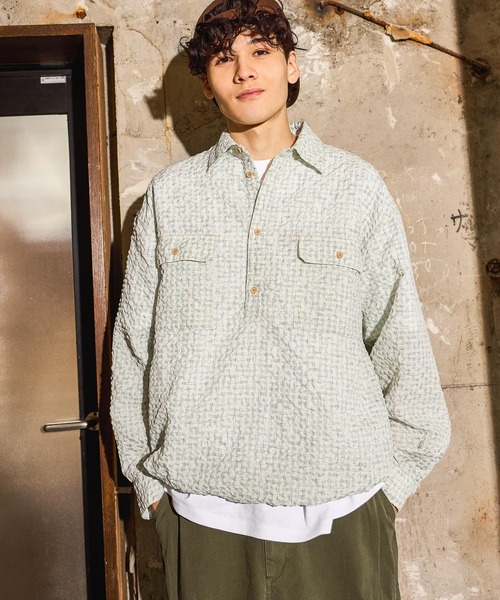 一枚でサマになる軽やかな着心地のトップス 【デザイン】 しぼ感のある表情が特徴のサッカー生地が、春らしさを加速させるプルオーバーシャツ。 洗い加工による掠れたような風合いとウッド調のボタンが柔らかい印象をプラスします。 裾についたドローコードでシルエット変化が可能。 カジュアルスタイルはもちろん、アウトドアや古着ライクなコーデにも使いやすい一着です。 【素材】 ポリエステル×レーヨン混の軽やかでさらっとした素材感。 サッカー生地で肌離れがよく、夏場の体温調節にも役立つアイテムです。 【サイズ】 ゆとりを持たせた肩幅と身幅、スタンダードな着丈でゆったりとしたシルエット。 【コーディネート】 デニムやチノ、スニーカーを合わせたカジュアルコーデ。 インナーにTシャツを重ねて、首元と裾でレイヤード見せするとこなれ感が増します。 ボトムスをスラックスに変えて革靴を合わせた、きれいめミックススタイルもおすすめです。 ▽おすすめの合わせアイテム▽ 品名:エクストラワイドチノパンツ 品番:636560 ※屋外の光や照明の当たり具合で、実際の商品の色味とカラー別画像の色味に違いが発生する場合がございます。商品の色味はスタジオ撮影の詳細画像にてご確認ください。 ※商品の色や質感を出来るだけ忠実に再現するよう心掛けていますが、実物と若干異なる場合がございます。 ※写真を許可無くコピー・転用することは固くお断りします。 ※取扱いアイテムは店舗により異なる場合がございます。
