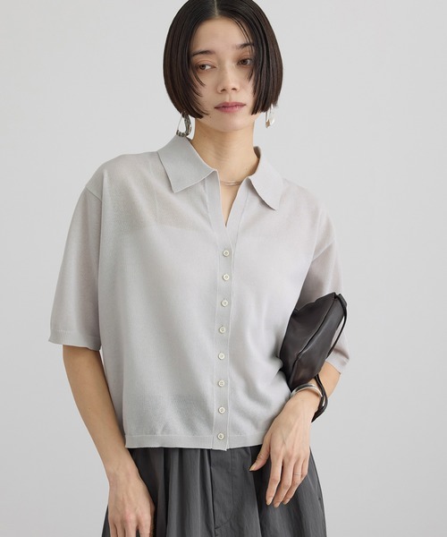 人気デザインが今年も登場、スキッパー襟で顔まわりをすっきり見せる軽やかなサマーニットカーディガン ■デザイン/シルエット 抜け感のあるスキッパーデザインが涼やかな印象を与えるニットカーディガン。 シャープな衿元が顔まわりをすっきりと見せ、シャツ感覚で着用できる一枚です。 ボタンを留めてプルオーバー風に、裾ボタンを外してベルトを覗かせたり、前を開けて羽織としても活躍。 ゆとりのあるサイズ感で風通しがよく、リラクシーな着心地を実現します。 ほどよいクロップド丈が目線を上げ、スタイルアップ効果も期待できます。 ※商品番号:SHK25040と同型・同素材です。 ■素材 ポリエステルにコンパクトコットンをカバリングした糸を使用したハイゲージニット。 肌に触れる部分はコットンのさらりとしたドライタッチで快適な着心地です。 上品な表面感と程よいシアー感が清涼感を演出し、軽量でシワになりにくいのも魅力。 ブラウンベージュ、ライトグレー、ダークネイビーの3色展開。 ■コーディネート キャミワンピースやオールインワンの羽織としてはもちろん、ボリュームボトムとも好相性。 スカートにもパンツにも合わせやすい丈感で、光沢ボトムと合わせた異素材ミックスもおすすめ。 肘にかかる袖丈で二の腕をさりげなくカバーし、夏まで長く活躍します。 ■ドライタッチシリーズ一覧 ・商品番号:SHK26060 商品名:ドライタッチスキッパーニットカーディガン ・商品番号:SHK26070 商品名:ドライタッチメタルボタンニットジレ ■モデル身長:166cm 着用サイズ:F ----------------------------- 裏地:なし 光沢感:なし 透け感:グレーややあり 伸縮性:あり 生地の厚さ:やや薄手 -----------------------------
