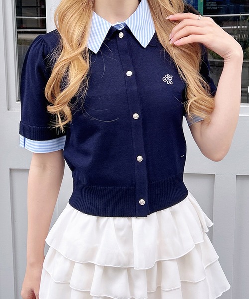 【スクール&ガーリーな雰囲気のレイヤード風半袖ニットトップス】 ▼Design 異素材のダブルカラーがスタイリッシュな半袖ニット。 シャツにカーディガンを合わせたようなドッキングデザインで、 1枚ですっきり着られるアイテムです。 胸元のロゴとフロントの金ボタンがアクセントに。 フロントボタンは開閉可能なので脱ぎ着しやすいのもポイント。 短めの丈なのでどんなボトムにもバランス良く合わせられます。 ▼Styling プリーツスカートを合わせてプレッピーなコーデに。 トレンドのバルーンスカートを合わせたガーリーな スタイリングもおすすめです♪ ・ボタン開閉可 ・ニット製品のため生地に伸縮性があり、サイズに若干の誤差が生じる場合がございます。予めご了承くださいませ。 【以下オフホワイト/ブルーストライプ参考。カラーにより多少の誤差あり】 ・透け感:やや透ける ・伸縮性:あり ・生地の厚さ:普通 ・裏地:なし ▼Recommend ・レイヤード風 ・ドッキング ・プレッピー ・ガーリー ・ストライプ ・ニット