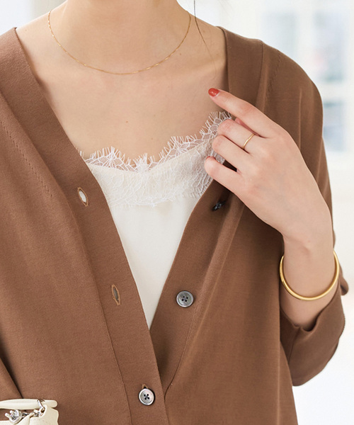レイヤードで旬なバランスに仕上がる、サテンレースキャミソール。トレンドのランジェリームードを取り入れた、繊細なレース使いが魅力のキャミソール。ほどよい光沢感のあるサテン素材が、スタイリングに女性らしさと抜け感をプラスしてくれます。速乾性の高いポリエステル素材を使用しており、汗ばむ季節まで快適に着られるのもポイント。ロンTやシャツに重ねて春らしく、夏にはタンクトップや半袖Tシャツとのレイヤードも楽しめます。シンプルなコーディネートに一点プラスするだけで、今年らしい着こなしが完成するプラスワンアイテムです。**********************透け感:なし裏地:なし伸縮性:なし光沢感:あり生地の厚さ:普通**********************【スタッフ着用コメント】《スタッフY》20代後半/身長:163cm/普通/普段サイズ:L/着用サイズ:Fサイズ感:比較的ゆったりめ。ストラップ部分は調整できるので丈感などは自分のスタイルんい合わせられる。素材感:とろみのあるサテン素材とレースの組み合わせで、より華やかなスタイルにできる。着心地:胸回りの圧迫感もなく、ゆったり着れる。速乾性のある素材なので夏まで活躍しそう◎**********************※取り扱いについては、商品についている品質表示でご確認ください。※こちらの商品は、Spick & Spanでの取り扱いになります。直接店舗へお問い合わせの際は Spick & Span店舗へお願い致します。※照明の関係により、実際よりも色味が違って見える場合があります。またパソコン・スマートフォンなどの環境により、若干製品と画像のカラーが異なる場合もございます。※商品の色味は、商品アップ画像をご参照ください。ホワイト着用スタッフ:161cm 着用サイズ:フリーブラウン着用スタッフ:160cm 着用サイズ:フリーネイビー着用スタッフ:160cm 着用サイズ:フリー詳細着用スタッフ:163cm 着用サイズ:フリー本体:手洗い可能