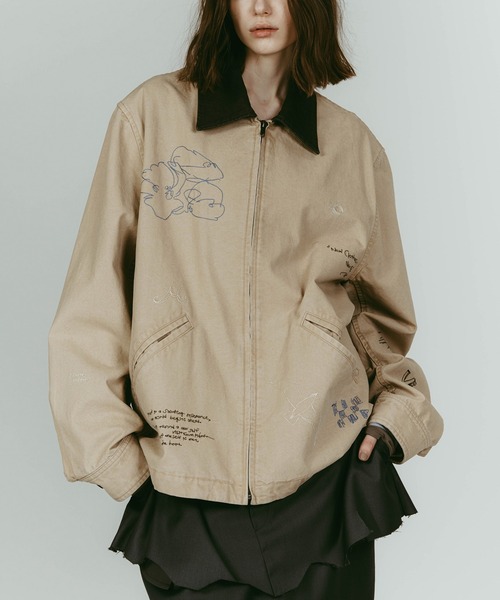 落書き風の刺繍がアクセントのKnuth Marfらしいジャケット。■pointハンティングジャケットのような雰囲気のジャケットです。全体に落書き風の刺繍をあしらい、個性あふれる一着。ジップアップで脱着しやすく、デイリー使いにもおすすめです。お尻が隠れるくらいのオーバーサイズなので春先はもちろん、秋口はニットを仕込んでもゆとりのあるサイズ感。大きめの襟で小顔効果も抜群です。【 Knuth Marf /クヌースマーフ 】ディレクターChiEmiを中心とした、アパレル、アクセサリー、雑貨ブランドです。レディース、ユニセックス商品を展開します。トレンドに沿った衣服だけではなく、一癖あるデザインを生み出すことで、ジェンダーレスな商品を多数生み出しています。KnuthMarfを身に纏った瞬間、新しい自分に出会えるように。 ≪お気に入り登録≫でお得な情報盛りだくさん・“商品のお気に入り登録”で再入荷通知やラストの通知、セール通知も受け取ることができます。・“ブランドのお気に入り登録”で新商品や再入荷など、お得な情報を受け取ることができます。※ご注文いただいた予約商品のお届け時期の確認は、注文履歴ページより行えます。