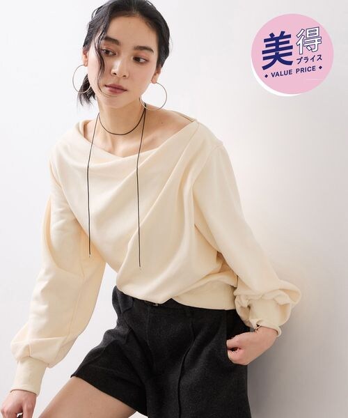 【2026 Spring】【26SS】 一枚でも華やかに。胸元のドレープデザインがレディなスウェット <POINT> ・デコルテラインで華奢見せを叶え、女性らしさを演出するドレープデザイン ・顔周りをスッキリ見せつつ華やかさも演出してくれるカシュクール風なドレープ ・カジュアルになりがちなスウェットを1枚で抜け感が出せる大人かわいく仕上げたデザイン ・ワンショルダー風にも着用できる2WAYデザインは春まで長く使える主役アイテム 【デザイン・シルエット】 トレンド感あるトップスは、季節の変わり目に1枚は持っていたいアイテム◎ 胸元の流れるようなドレープデザインがこなれ感のある1着。シンプルなボトムスに合わせても、上品なコーデにしてくれるレディライクなアイテム。 【素材】 柔らかなスウェット素材は着心地が良く、合わせるアイテムを選ばないのも嬉しいポイント。 【カラー】 大人っぽい女性らしい雰囲気の出るチャコール、カジュアルに着回しのきくライトグレー、ボトムのカラーを選ばないベージュ、フェミニンでかわいらしさを演出できるピンクの4色に加えて上品な印象のネイビーとなっています。 ※ネイビー(40):はWEB限定展開となります。 【おすすめのスタイリング】 デニムとのカジュアルな雰囲気、スラックスと合わせてハンサムな雰囲気もお楽しみいただけます。 着丈もコンパクトに仕上げているので腰回りすっきりなスカートとも相性〇。マーメイドスカートでフェミニンに仕上げることもできます。 首周りは華奢なアクセサリーを入れてドレープデザインを活かすのがおすすめ。 ----------------------------- 裏地:なし 光沢感:なし 透け感:ベージュ(27)のみややあり 伸縮性:ややあり ポケット:なし ボタン:なし 生地の厚さ:普通 その他仕様:ワンショルダーも可能 季節:春、秋 ----------------------------- 【モデル着用サイズ】 身長:168cm 着用サイズ:F ※ネイビー(40)はWEB店舗限定の商品です。実店舗での販売はしておりません。 ※画像の商品はサンプルです。 実際の商品と仕様、加工、サイズが若干異なる場合がございます。 ※画像によっては実際の色味と異なる場合があります。正しい色味は生地アップ画像をご確認ください。