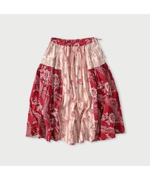 海を越えたパッチワークムラや綿の欠片の飛び込みがあっても美しいと思えるインドカディの生地はインドの村々の家庭で大切に紡がれ、織られています。温かみのある素朴な生地のふくらみは現代の機械で出せない大好きな風合い。ヴィンテージの生地から着想した西洋の柄がインドブロックプリントの手仕事の味わいと美しく調和しています。3つの柄を組み合わせ、すこしだけギャザー分量を抑えた軽やかなパッチワークスカートです。