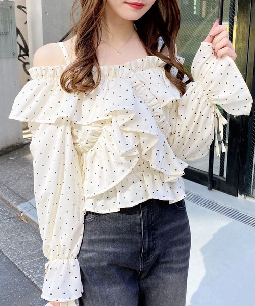 胸元でクロスさせたたっぷりフリルが着こなしに表情をプラス。 ボリュームのあるシルエットながら オフショルデザインですっきり着こなせるブラウスです。 調節可能なショルダーストラップは取り外し可能。 袖口にはリボンをあしらってキュートなアクセントにしています。 チェック柄やドットなどのバリエーションが揃っているので自分らしい1枚が見つかります。 ・肩紐調整可 ・肩紐取り外し可 【以下クロ/チェック参考。カラーにより多少の誤差あり】 ・透け感:やや透ける ・伸縮性:なし ・生地の厚さ:普通 ・裏地:なし