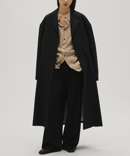 国内の上質なウール100%生地を使用したコート。細番手のウールを強く撚ることで生まれるしなやかさと、表情のあるシャンブレーカラーが魅力です。オーバーショルダーのシルエットに、コンパクトな襟を組み合わせてバランスよく仕上げました。羽織るだけでスタイリングを引き締め、幅広いシーンで活躍する一枚です。