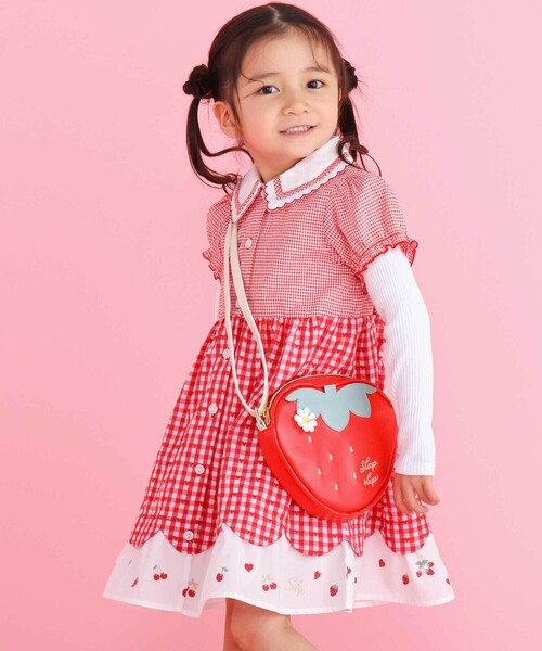 -26SS- ティアード襟とスカラップ裾がキュートで上品なワンピース。 ■デザイン 女の子にぴったりのティアード襟付きチェック柄ワンピース。 チェック柄の中には小さなハートが隠れていて、探す楽しさもプラス。 スカートはスカラップデザインで、裾の切り替えにはギャザーを施し、イチゴやチェリー、ハートの柄を散りばめたキュートな仕上がりです。 レッド系のギンガムチェックとブルー系のチェックの2色展開。 おしゃれでかわいいデザインは、普段使いからお出かけまで幅広く活躍します。 ■素材/機能 肌触りがよく、適度な耐久性とドレープ性を兼ね備えた生地を使用しているので、動きやすく快適な着心地を実現しました。 前ボタン開きで着脱も簡単。 ▼お揃い 1810-81548:ワンピース 1810-81515:スカパン 1822-82014:2点セット 1837-82100:スカート付きボディミニ(レッド系) ※柄の出方は生地の裁断により一点一点異なります。 ※右脇ポケットあり。 ※モデルが持っているポシェットは別売りです。 26春夏アイテム 【2026年2月のテーマ / Blooming Garden】 楽しいことも、おいしい時間も、一緒に分け合うよろこび。 やさしい気持ちになれるハート柄や愛らしい動物たちのモチーフに、あたたかなカラーを散りばめて。 大切な人と想いを共有できる、やさしく幸せなコレクション。 【2026 SPRING SUMMER / Wishing you joy-喜びが訪れますように-】 すてきな一日を願う気持ちをお洋服に込めて。 誰かを想うやさしさと、あたたかなぬくもりを感じながら、毎日が小さな幸せで満たされますように。 優しくてあたたかなイメージのコレクション。 【SLAP SLIP(スラップ スリップ)】 ~子どもの欲しいをカタチに~ ヨーロッパのこどものように 子どもらしい今しか着れないナチュラルなかわいさを提案 どこか上品で清楚感漂うフレンチカジュアルは いつものコーディネートをさりげなく格上げ
