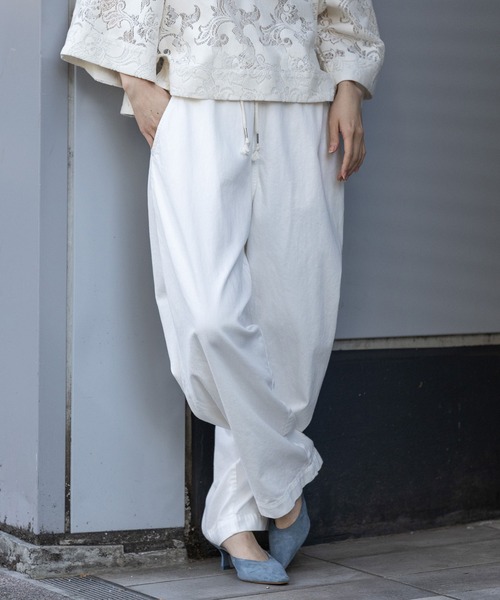 □ Munich 2026 spring & summer collection □◆程よい落ち感と軽さがポイントでリラックス感あるカジュアルコーデの主役になれるイージーパンツ◆<MATERIAL>ホワイト:ナチュラルな表情の10/- x 20/-を甘めに織った8ozデニムで、度詰めに織ると1ozくらい重くなるので糸番手からするとかなり軽くて柔らかなデニムでふくらみもあります。坂本デニムのエコ染色システムで染められており、洗浄薬品や温水を使わないことで素材、環境への負荷が従来の染色方法から格段に軽減されています。ワンウォッシュでキレイ目に仕上げています。オフホワイト&ネイビー:ライトオンスのヒッコリーで経糸のストライプにはロープインディゴ染色を施した糸を使っているので中白で、デニムと同じように色落ちします。製品ワンウォッシュ仕上げです。<DESIGN>股上深くゆるいサイジングにドロスト仕様のウエスト、洗いのかかったソフトなデニムの組み合わせですごくリラックスした雰囲気のカジュアルコーデが作れるワイドパンツです。ゴムウエストですがトップスインもおすすめできるアイテムです。太目のベルトとボリュームのあるシルエットによって、上半身がすごくコンパクトに見せれるのでシンプルなカットソー合わせやショートシャツとの相性はバツグンです。<COLOR>■ホワイト:クリアなホワイトが、素材の軽やかさと相まって清潔感と涼しげな印象のカラー■オフホワイト:やわらかなオフホワイトにネイビーのストライプが映える、爽やかで抜け感のあるカラー■ネイビー:深みのあるネイビーにホワイトのストライプが効いた、クラシカルで知的な印象のカラー※光のあたり具合いやパソコンなどのモニター環境によって実際の色味と異なって見える場合がございますので、予めご了承ください。※着用商品はサンプルです。サイズ等の仕様に若干の変更がある場合がございますので、予めご了承ください。※お取扱いについては、商品についております品質表示、アテンションタグにてご確認ください。洗濯:洗濯機洗い可.............................≪INFORMATION ≫............................▼商品のお気に入り登録▼『♡』マークを押してお気に入り登録して頂いた商品は、セール開催の通知やクーポン発行などのキャンペーンなど、お得な情報をいち早く受けとる事が出来ますので、ぜひご登録ください。
