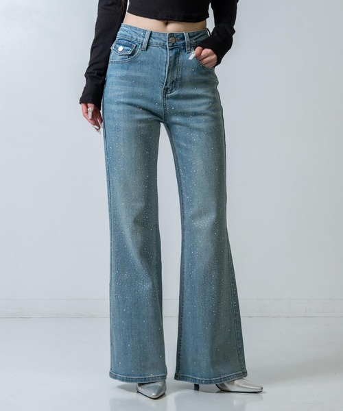 視線を奪う、静かに煌めくフレアライン●動くたびにきらりと光るラインストーン。●計算されたフレアシルエットが、脚を美しく引き伸ばします。●デニムのカジュアルさに、洗練された輝きを添えた一本です。♦detail程よくフィットする腰まわりから裾に向かって広がるフレアラインが、自然なスタイルアップを叶えます。全面に散りばめられたラインストーンが光を受けて上品に煌めき、シンプルなトップス合わせでも印象的な存在感を発揮。ヴィンテージ感のある色落ち加工が奥行きを生み、甘さを抑えたバランスに仕上げています。しっかりとしたデニム生地でシルエットを美しく保ちながら、日常使いしやすい穿き心地も魅力です。♦styling〇モードグラマースタイル→タイトなトップスやヒールを合わせて、縦ラインを強調した着こなしに〇ストリートミックススタイル→クロップドトップスやスニーカーで抜け感のあるバランスに〇きれいめエッジスタイル→ジャケットやポインテッドトゥを合わせて、洗練された印象にまとめる♦コーデにオススメVネック ぴたっと クロップド ロングスリーブ Tシャツ(153-6042)フロントツイスト ぴたっと ロングスリーブ Tシャツ(153-6041)-----------伸縮性・・・あり透け感・・・なし光沢感・・・なし生地の厚さ・・・ふつうポケット・・・あり裏地・・・なし-----------<サイズ>SM※本製品は特殊な加工を施しているため、一点一点風合いが異なります。特に、再生産・再入荷の時期により、染めムラや色落ち感など色合い、サイズ感に若干の個体差が生じる場合がございます。あらかじめご了承ください。※この商品は非常に色落ち、色移りしますので十分ご注意ください。※商品のお取扱いに関しましては、商品に付属のアテンションカード、洗濯ネームをご覧ください。※モデル着用画像は光の当たり具合で色味が違って見える場合がございます。※商品の色味の目安は、商品単体の画像をご参照ください。【お買いものをお楽しみいただく為に!】▼商品のお気に入り登録完売カラーの再入荷通知や、ラスト1点の通知、セールの通知も受け取ることができます。▼ブランドのお気に入り登録新商品や再入荷など、いち早くブランドのお得な情報を受け取ることができます。