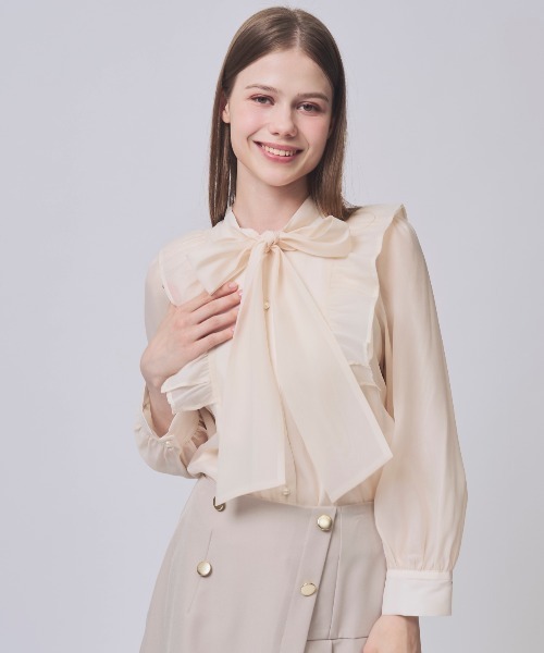 【エアリーなボウタイリボンが華やぐ、シアーフリルデザインブラウス】 【Point】 ・首元の大きめボウタイリボンが視線を惹き、顔まわりをぱっと華やかに演出します。 ・肩からフロントにかけてあしらったフリルが、さりげない甘さをプラス。 ・程よい透け感のある軽やかな素材で、女性らしい印象を演出します。 ・ふんわりとしたスリーブデザインが二の腕をカバーし、やわらかなシルエットをメイク。 ・・インでもアウトでもバランスよく決まり、スカートにもパンツにも合わせやすい一枚です。 ケア方法:手洗い可能 透け感:袖のみあり 裏地:あり 伸縮性:なし 光沢感:なし 生地の厚さ:薄手 F:(00):着丈 56㎝/肩幅 31㎝/バスト 94㎝/袖丈 58㎝/袖幅 20.7㎝/袖口幅 12㎝/裾回り 102㎝