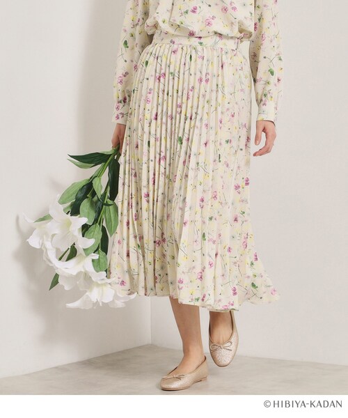 【デザイン】 ~ITS’DEMO × HIBIYA-KADAN~ 日比谷花壇のフローリストが描いたフラワーグラフィック。 2026の新作パターンからセレクトした柄をイッツデモオリジナルカラーにアレンジ。 シリーズ第一段は、春を代表するお花のひとつとして有名なスイートピーを中心に展開。 ~春の訪れを告げる花~ まだ寒さの残る季節からフリルのような可憐な花から甘く優しい香りを漂わせ、私たちを優しく癒してくれます。 スイートピーの花言葉は「門出」「別離」「ほのかな喜び」「優しい思い出」。 フリルをまとった花びらに透明感のある柔らかな雰囲気を持つスイートピーは、どこか羽を伸ばしてひらひらと飛び立っていく蝶の姿のよう。 卒業や就職、移動・退職などで新しい門出を迎える春にぴったりなお花です。 軽やかな楊柳素材を使用したプリーツスカート。 華やかさのあるアコーディオンプリーツデザインで、裾に向かってプリーツを絶妙に消すことで より軽やかにふんわりと広がるシルエットを表現。足元をエレガントに演出してくれます。 サイドファスナー開きのデザインで美シルエットを活かしつつも、後ろウエストはゴム仕様なので締め付け感の少ない着心地。 お揃い柄のブラウス【P93-55514】と合わせれば、ワンピース風のスタイルが叶います。 【素材】 ポリエステル楊柳素材を使用。 【仕様】 ・ポケットなし ・左脇ファスナー ・ウエスト後ろゴム ・裏地あり ※こちらの商品はやや透け感があります。 ※照明の関係により、実際よりも色味が違って見える場合があります。また、パソコン・スマートフォンなどの環境により、若干製品と画像のカラーが異なる場合もございます。 ---------------------------------------- ★お気に入り登録がおすすめ★ ▽気になる商品はハートマークをクリック! ・再入荷やセールの通知をお知らせ ・お気に入り一覧からいつでもチェック ▽ブランドのお気に入り登録も! ・新商品やお得な情報をい モデル情報:身長164cm B80 W60 H84 着用サイズ:00(フリーサイズ) 店舗へのお問い合わせ商品番号:P93-65506 ●製品寸法: 00(フリーサイズ):W68cm H134cm 総丈79cm 備考: