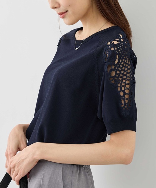 ラグラン×レース刺繍が魅せる大人の華やぎ、シンプルコーデを格上げする袖レースニット。八方映えニット どこから見られても、スキなくステキ! 機能性抜群の万能トップス。 : 【素材感】 ・レーヨンナイロン総針編みでややハリ感がある素材。 ・サラッと滑らかな肌触りで快適な着心地。 ・目面の美しいクリーンな表面感、高見えする上質ニット素材を使用。 【機能素材】 ・UVカット:紫外線遮蔽効果のある素材を使用(紫外線遮蔽率90%以上)。 ・接触冷感:ひんやりとした肌触り。 ・洗濯機OK:ご自宅でマシンウォッシュが可能。 ・毛玉になりにくい素材。 ・EASY CARE:シワになりにくく、洗濯後のお手入れがしやすい。 ・遮熱:太陽光などから発生する放射熱を遮り、温度上昇を抑制する素材を使用。 ・近赤外線ケア:この商品は近赤外線(遮蔽率(波長780-2600nm)80.0%)をケアする素材を使用。 肌に悪影響を及ぼす近赤外線をケアする効果により肌への負担を軽減させることが期待できる。 【デザイン・シルエット】 ・ラグランスリーブ肩部分にレース刺繍を施し、涼やかな印象に。 ・ゆったりシルエット×クルーネック、体型カバーときちんと感を両立。 ・ジャスト丈×半袖デザインで、バランス良く軽やかな印象のニットトップス。 【カラー】 ・オフホワイト、ネイビー、サックス、クリームの4色展開。 ・上品さと華やかさを両立したカラーリング、きれいめにもカジュアルにも対応。 ・差し色としても使える万能カラー、コーディネートに程よいアクセントをプラス。 【スタイリングポイント】 ・デニムやワイドパンツと好相性、きれいめカジュアルな大人コーデが完成。 ・スカート合わせでフェミニンスタイル、一枚で主役になる袖レースデザイン。 ・ジャケットやカーディガンのインナー使いで、レイヤードスタイルにも対応。 【前シーズンの八方映えニットシリーズをアップデート】 ・遮熱機能と近赤外線ケアが追加。 【八方映えニットシリーズ】 ・ハーフスリーブニットプルオーバー(品番:GDM16500) ・袖レースニットプルオーバー(品番:GDM16510) ・ケープ風ハーフスリーブプルオーバー(品番:GDM16530) ----------------------------- 裏地:なし 光沢感:なし 透け感:オフホワイト(15)はややあり、その他カラーなし 伸縮性:あり 季節:春、夏、秋 ----------------------------- ※撮影時の光、お使いのモニター環境によって色の見え方が違う場合がございます。 ※2025年秋冬商品より、ワンサイズ展開の商品は「F(フリーサイズ)」表記に変更しております。 詳しい採寸はサイズ欄をご覧ください。 【モデル着用サイズ】 身長:165cm 着用サイズ:F 【2026 Spring/Summer】【26SS】