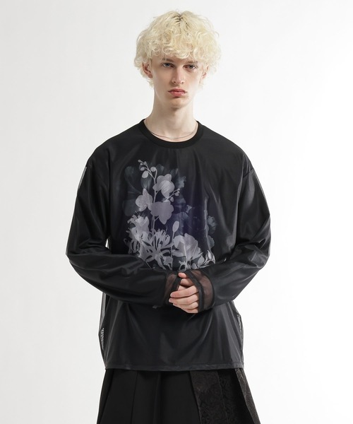 ーーー シアーのヴェール越しに浮かび上がる花柄が、妖艶な奥行きを生むトリックデザインカットソー。 ーーー DESIGN フロントに大胆なフラワープリントを施し、その上からシアー生地をふわりと重ね合わせることで、柄に独特の奥行きとミステリアスな表情を持たせた一着。 ただプリントするだけでなく、「透け感」を利用して視覚的なトリックを仕掛ける、HAREらしい遊び心とモードな感性が光るデザインです。 シアー越しに見える曖昧な花柄が主張を程よく和らげてくれるため、一枚着としてはもちろん、ジャケットやブルゾンのインナーから覗かせても、色気のあるアクセントとして活躍します。 MATERIAL ベースとなる肌触りの良いカットソー生地の上に、繊細で軽やかなシアー生地をドッキングしています。 見た目は複雑で高度なレイヤードスタイルですが、着心地は一般的なロングTシャツのように軽く、ストレスフリーに着用できるのも魅力です。 ※サンプルにて撮影をしておりますので、実際の商品とは仕様や加工・サイズ等が若干異なる場合がございます。 ※屋外の光や照明の当たり具合で、実物と色味が異なって見える場合がございます。詳細画像の色味をご確認ください。 なお、商品の色や質感を出来るだけ忠実に再現するよう心掛けておりますが、パソコンなどの環境により、実物と若干異なる場合がございます。 ※写真を許可無くコピー・転用することは固くお断りします。
